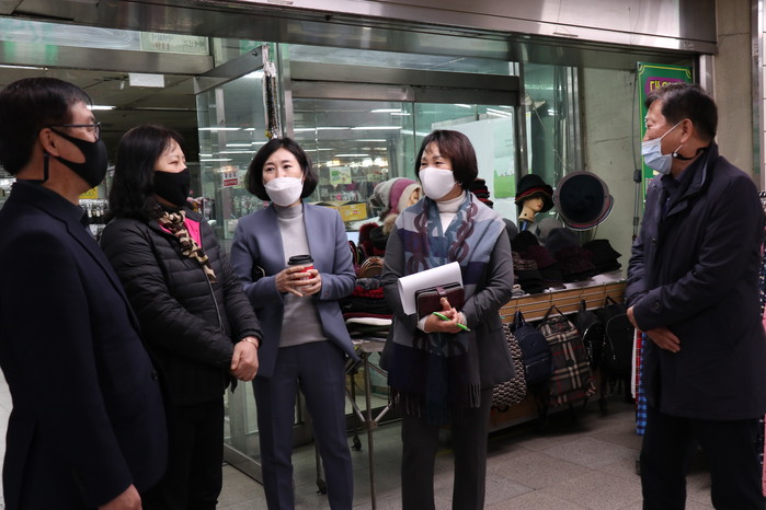 | ▲ 박경희 의장(오른쪽 두 번째)이 홍제역 지하상가 일대 상인의 애로사항을 청취하고 있다. (사진제공=서대문구의회) |