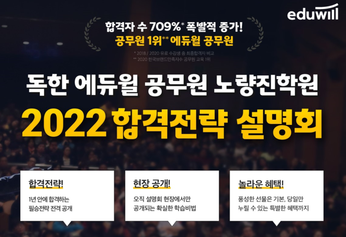 [시민일보 = 여영준 기자] 종합교육기업 에듀윌(대표 박명규)이 운영하는 독한 에듀윌 공무원 노량진학원은 오는 3월 개강을 앞두고 오는 27일 오후 2시 '2022 합격전략 설명회'를 개최한다.