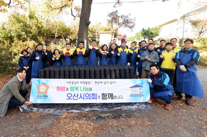 이날 시의회에서는 차량이 진입할 수 없는 골목길에 거주하는 저소득층 가정을 선정받아 사랑의 연탄 1000장을 시의원과 시 1472살핌팀, 사닥다리봉사대(오산시시설관리공단 소속) 등 총 22명이 릴레이 방식으로 직접 연탄을 나르고 배달과 함께 따뜻한 정(情)도 전달했으며, 영하의 날씨에도 불구하고 장인수 의장, 김영희 부의장, 김명철·이상복·성길용·이성혁·한은경 의원은 사랑 나눔 실천에 함께 참여해 어려운 이웃의 겨울나기를 지원했다.