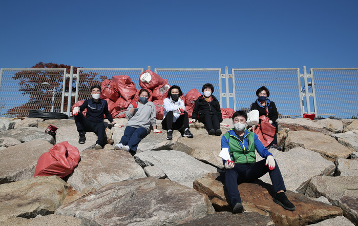 | ▲ 영종도 해안에서 쓰레기를 주운 생활정책 연구단체 의원들이 기념촬영을 하는 모습. (사진제공=성동구의회) |