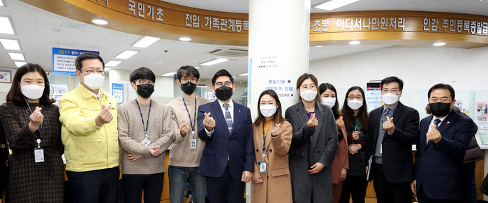 | ▲ 행정복지센터를 방문한 신은호 의장(오른쪽)이 관계자들과 기념촬영을 하고 있다. (사진제공=인천시의회) |