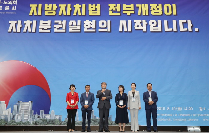 송 의장은 19일 오후 경북 경주 화백컨벤션센터에서 열린 ‘지방자치법 전부 개정을 위한 영남권 시·도의회 정책 토론회’에 참석해 “지방자치법이 전면 개정돼야만 주민의 삶을 바꾸고 지방을 살릴 수 있다”고 강조했다.