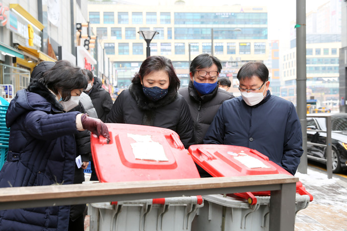 현장을 둘러본 의원들은 인도 위 적재물과 음식물쓰레기 수거통이 보행로와 자연미관을 침해한다며 적재물은 주기적 단속을 통해 경각심을 제고하고, 음식물쓰레기 수거통은 사유지내 공터에 배치할 수 있도록 유도할 것을 개선 방안으로 제시했다.
