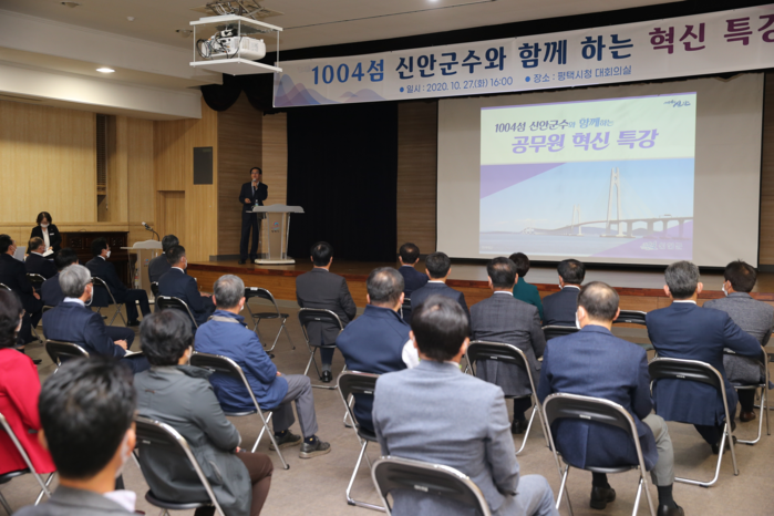 박우량 신안군수가 27일 오후 평택시청 대회의실에서 전 공직자를 대상으로 ‘신안군수와 함께하는 혁신 특강’을 했다.