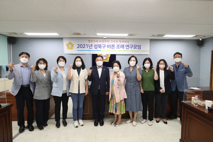 성북구 바른 조례 연구모임은 구 현존 조례를 정비하고 나아가 새로운 조례를 발굴하는 것을 목적으로 정혜영(대표)·정해숙(간사)·진선아·안향자·양순임·임현주·김우섭 의원이 참여하고 있는 의원 연구단체다.