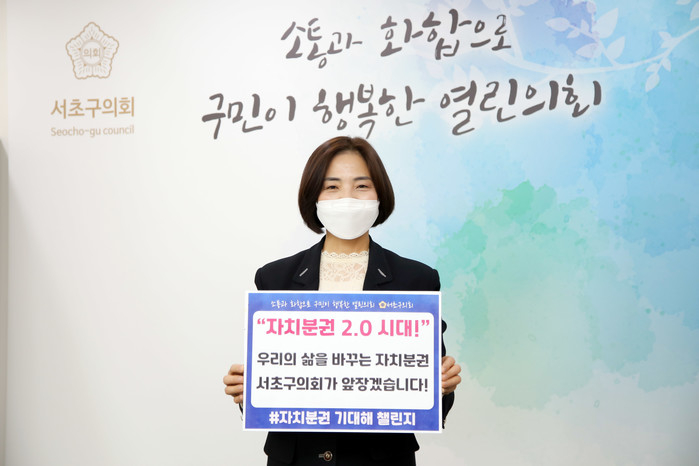 김안숙 의장은 “2021년은 지방자치가 실시된 지 30년을 맞이하는 해로서, 서초구의회는 지방자치법 전부 개정안 통과를 환영하고 지방자치의 주체인 주민중심의 자치분권 실현을 통해 자치분권 2.0시대를 열어나가기를 희망한다”고 기대를 밝혔다.