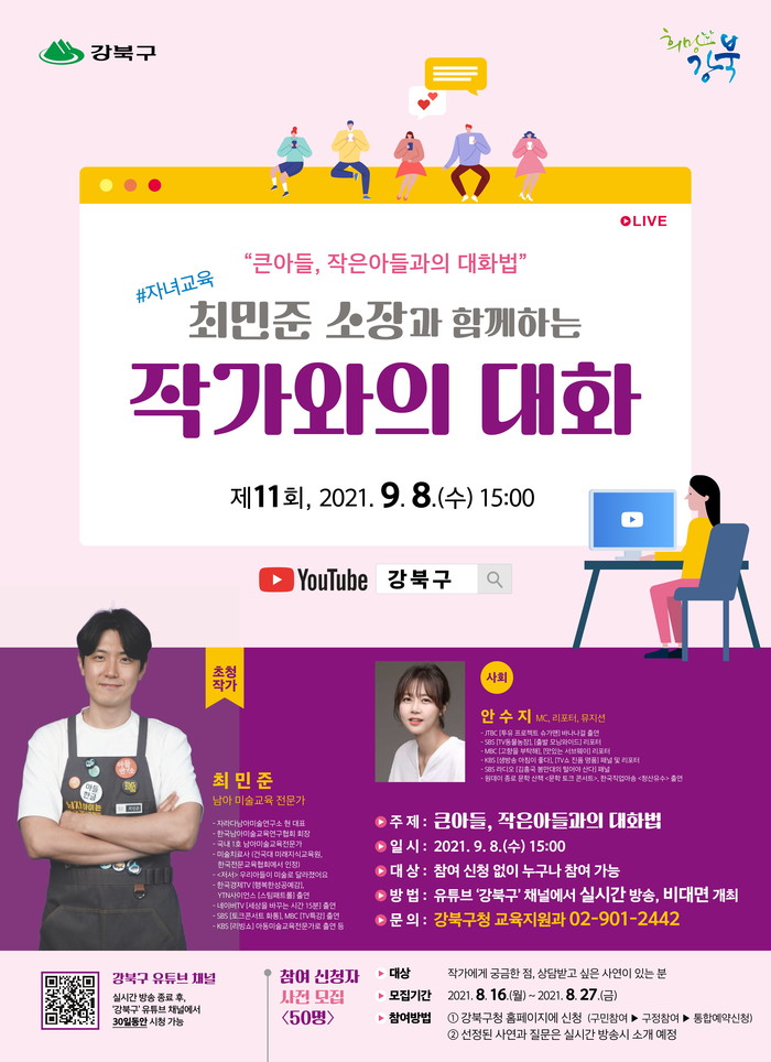 박겸수 구청장은 "이번 작가와의 대화가 자녀를 양육하는 부모에게 유익한 시간이 되길 기대한다"라며 "아이 눈높이에 맞는 대화법을 배우고 싶은 분들의 많은 참여가 있기를 바란다"라고 말했다.