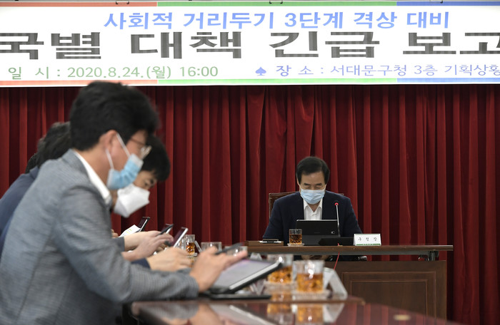 서울 서대문구가 코로나19의 전국적인 재확산과 관련해 24일 구청 기획상황실에서 문석진 구청장 주재로 간부 직원들이 참석한 가운데 사회적 거리두기 3단계 격상에 대비한 긴급회의를 열고 대책을 논의했다. 사진은 문 구청장이 회의를 주재하는 모습. (사진제공=서대문구청)