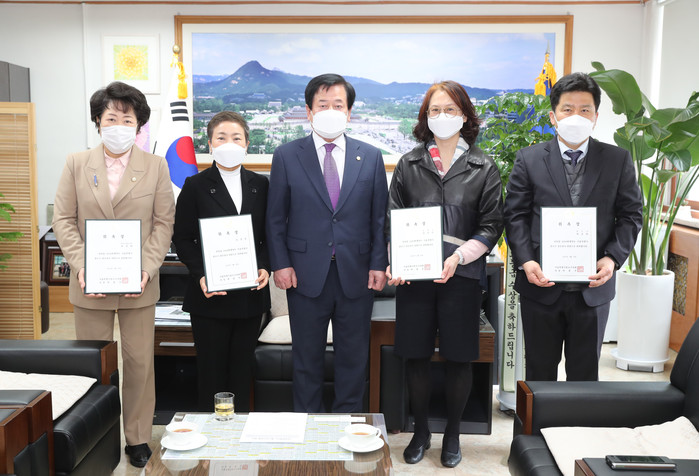 | ▲ 여봉무 의장 (오른쪽 세번째)가 결산검사위원들에게 위촉장을 전달하고 기념촬영을 하고 있다. (사진제공=종로구의회) |