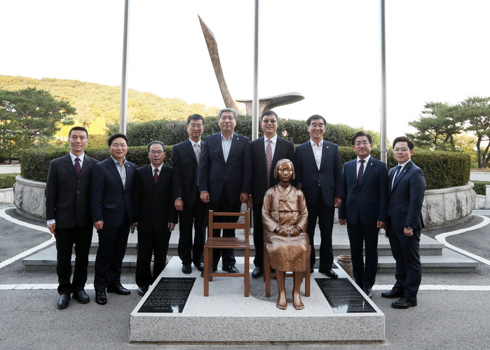 ▲ 최근 중국 광둥성 대표단을 접견한 경기도의회 의원들이 평화의 소녀상 앞에서 기념촬영을 하고 있다. 이날 양측은 환경오염 문제 공동대응 등을 집중 논의했다. (사진제공=경기도의회) |