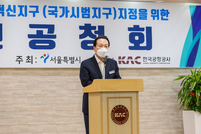 노현송 서울 강서구청장이 29일 ‘김포공항 도시재생 혁신지구 지정을 위한 공청회’에 참석해 참석자들과 공항과 주변지역 간 공간·기능적 연계 방안을 통한 지역 활성화 등에 대해 논의했다. 사진은 공청회에 참석한 노 구청장이 축사를 하는 모습. (사진제공=강서구청)