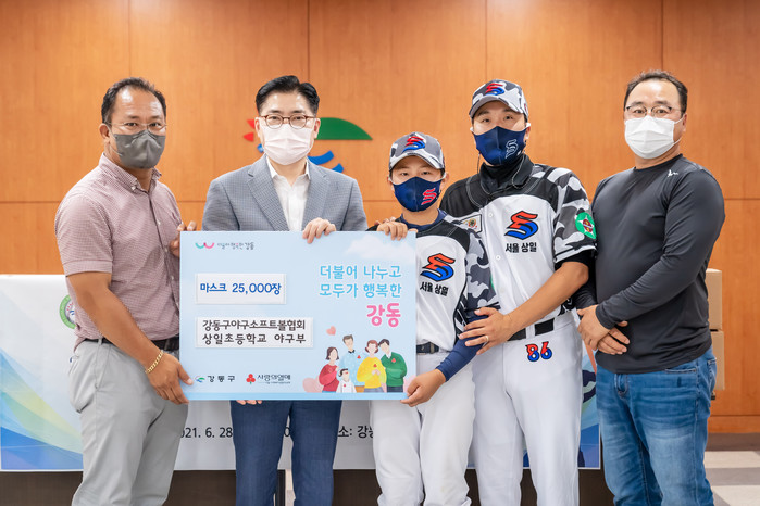 서울 강동구는 28일 강동구 야구소프트볼협회와 상일초등학교 야구부로부터 소외된 이웃들을 위한 마스크 2만5000장을 기부받았다. 이날 전달된 마스크는 동주민센터를 통해 기초생활수급자·차상위계층 등에 배부할 예정이다. 사진은 전달식에서 이정훈 구청장(왼쪽에서 두 번째)과 관계자들이 기념촬영을 하는 모습. (사진제공=강동구청)