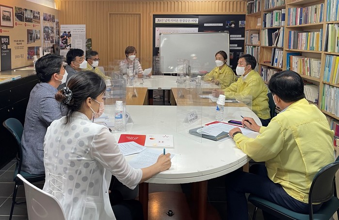 서울 은평구는 지난 19일 보건복지부와 합동으로 장애인거주시설 ‘은평재활원’을 방문해 코로나19 사회적 거리두기 4단계 격상에 따른 시설 감염병 예방수칙 준수 등 방역 실태를 살피고 현장의견 청취를 실시했다. 사진은 구청 관계자들과 보건복지부 관계자들이 현장 합동점검을 실시한 후 의견을 나누고 있는 모습. (사진제공=은평구청)