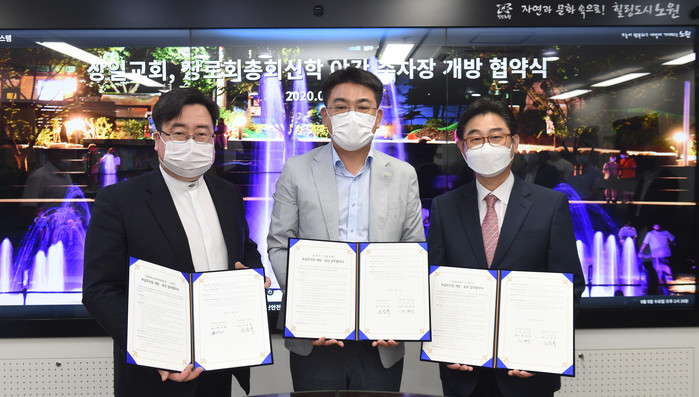 노원구는 최근 구청장실에서 장로회 총회신학 및 상일교회와 부설주차장 야간개방 협약을 체결했다. 이 협약으로 총회신학은 주차장 30면을 24시간 개방하며 상일교회는 주차장 7면을 평일 24시간, 토·일요일은 부분 개방한다. 사진은 협약식에서 오승록 구청장(가운데)과 관계자들이 기념촬영하는 모습. (사진제공=노원구청)