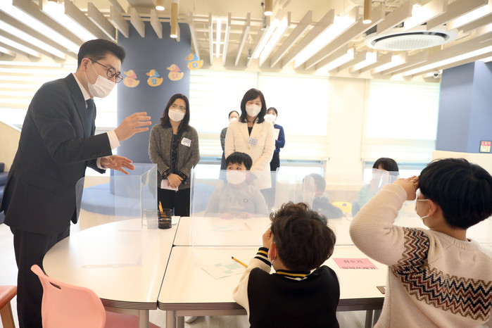 강동구가 16일 우리동네키움센터 돌봄현장 점검에 나서 코로나19 거리두기 단계에 따라 긴급돌봄체계로 운영되고 있는 돌봄 환경을 점검하고 종사자의 애로사항을 청취했다. 사진은 이정훈 구청장(왼쪽)이 강일동 키움센터를 방문해 돌봄 현장을 점검하고 있는 모습. (사진제공=강동구청)