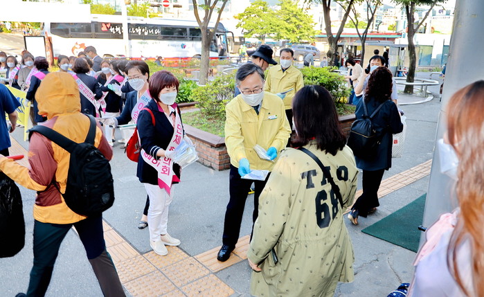 금천구는 최근 금천구청역 앞에서 금천구여성단체협의회 회원들과 함께 ‘코로나19, 힘을내요!’ 캠페인을 진행했다. 이날 캠페인에는 유성훈 구청장을 비롯한 관계 공무원들과 금천여성단체협의회 회원 20여명이 참석했다. 사진은 유 구청장(가운데)이 시민들에게 주민건강마스크를 건네는 모습. (사진제공=금천구청)