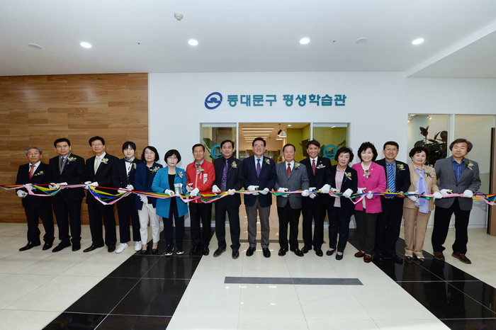 ▲ 지난 4월 열린 '동대문구 평생학습관 개관식'에서 유덕열 구청장을 비롯한 참석자들이 기념촬영을 하고 있다. (사진제공=동대문구청) |