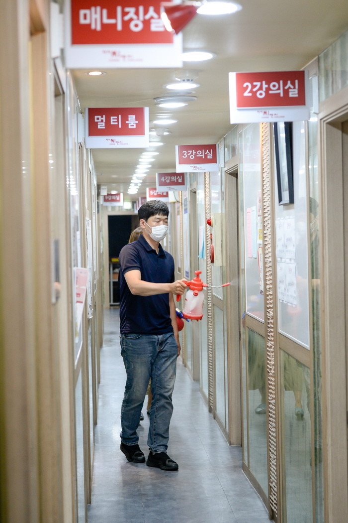 서울 양천구는 최근 정부의 강화된 거리두리 2단계 조치에 따라 대형학원(300인 이상), PC방, 노래연습장 등 고위험시설을 대상으로 집합을 금지하고 이행 여부를 점검하기로 했다. 사진은 구에 위치한 대형학원의 관계자가 최근 학원 방역작업을 진행하고 있는 모습. (사진=양천구청)
