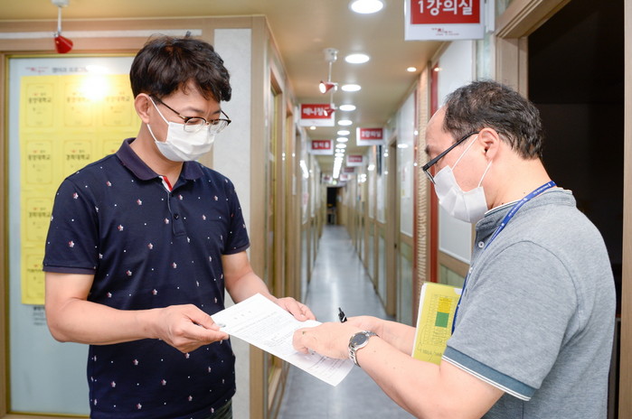 서울 양천구는 최근 정부의 강화된 거리두리 2단계 조치에 따라 대형학원(300인 이상), PC방, 노래연습장 등 고위험시설을 대상으로 집합을 금지하고 이행 여부를 점검하기로 했다. 사진은 구 소속 관계자가 최근 구에 위치한 학원에서 직원에게 집합금지명령서를 전달하고 있는 모습. (사진=양천구청)