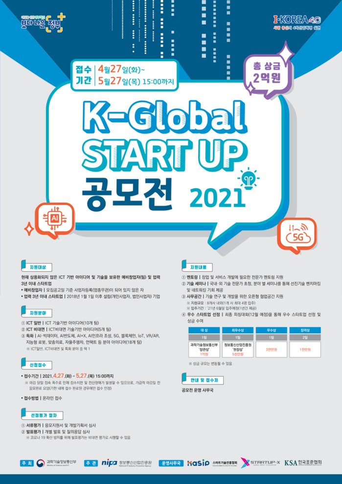‘K-Global 스타트업 공모전’은 과학기술정보통신부가 주최하고, 정보통신산업진흥원이 주관하는 올해로 12년째 이어지고 있는 국내 최대 ICT분야 창업 공모전이다.