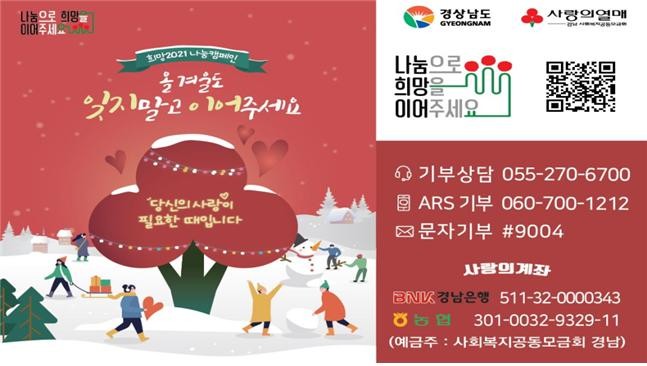 경남 함양군은 연말연시를 맞아 어려운 이웃과 나눔을 통해 따뜻하고 더불어 사는 사회 풍토를 조성하고 건전한 기부문화 확산을 위해 ‘희망2021 나눔 캠페인’을 실시한다.
