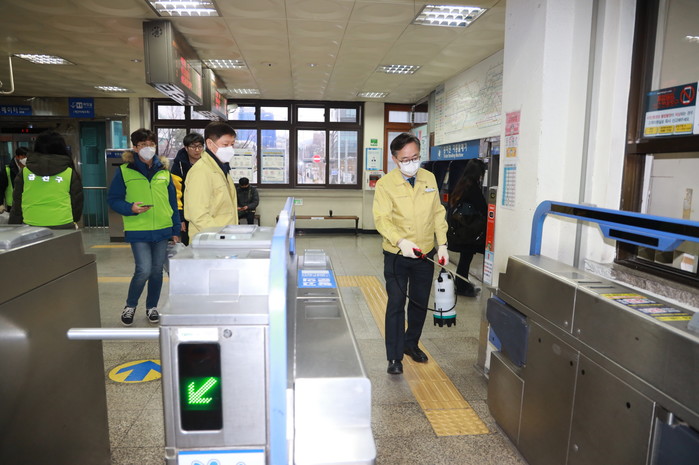 유성훈 서울 금천구청장은 코로나19 확산 방지를 위해 최근 방역요원들과 함께 구민들이 가장 많이 이용하는 금천구청역 곳곳을 소독했다. 사진은 유 구청장이 관계자들과 함께 금천구청역 내부를 소독하고 있는 모습. (사진제공=금천구청)