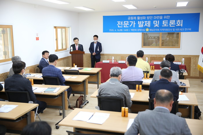 [해남=정찬남 기자] 전남 해남군의회 의원연구단체인 '지역자원조사 및 네트워크 연구회'는 최근 해남읍 소재 백련재 문학의 집에서 분야별 전문가를 초청해 ‘공동체 활성화 방안 마련을 위한 토론회’를 개최했다.