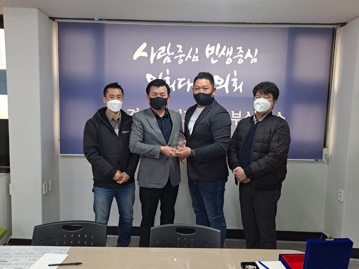 | ▲ 권재형 의원이 민락동 우미린더스카이 및 센트럴17단지 아파트 입주민대표자로부터 공로 감사패를 전달 받고 기념촬영을 하는 모습. (사진제공=경기도의회) |