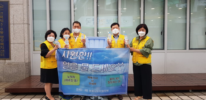 서울 중랑구 면목3·8동에서는 행복나누리협의체와 함께 오는 8월까지 동주민센터를 찾는 주민과 노약자를 위해 동주민센터 앞 데크에 얼음물 아이스박스를 비치하고 무료로 제공한다. 사진은 20일 동주민센터 내방객을 위한 얼음물 나눔행사를 진행하고 기념사진을 촬영하고 있는 모습. (사진제공=중랑구청)