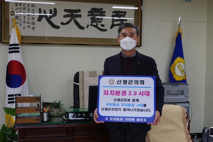 [산청=이영수 기자] 심재화 경남 산청군의장은 25일 자치분권 기대해 챌린지 캠페인에 동참하며 “주민 중심 자치분권 시대를 산청군의회가 함께 열어나가겠다”는 메시지를 전달했다.