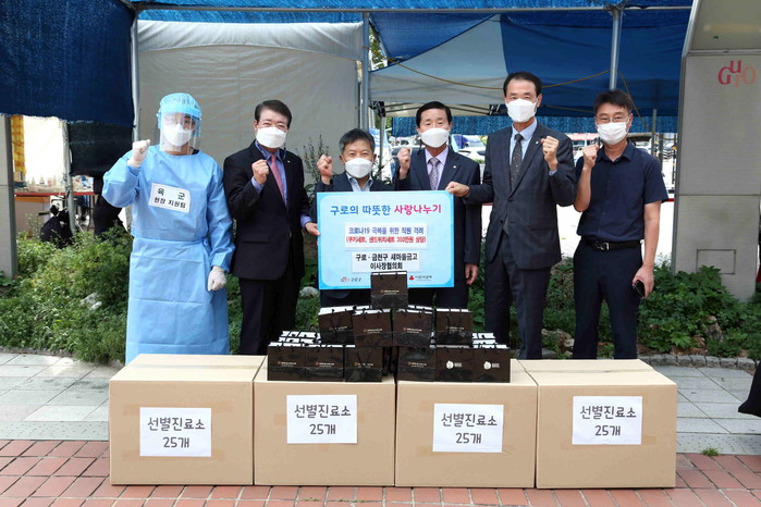 MG새마을금고 서울 구로·금천구 이사장협의회가 최근 이틀간 장기간 코로나19 대응으로 지친 근무 종사자들을 위해 새마을 금고 16개 지점에서 뜻을 모아 준비한 격려물품을 전달했다. 사진은 구로보건소 선별진료소 앞에서 열린 전달식에서 관계자들이 기념촬영을 하는 모습. (사진제공=구로구청)