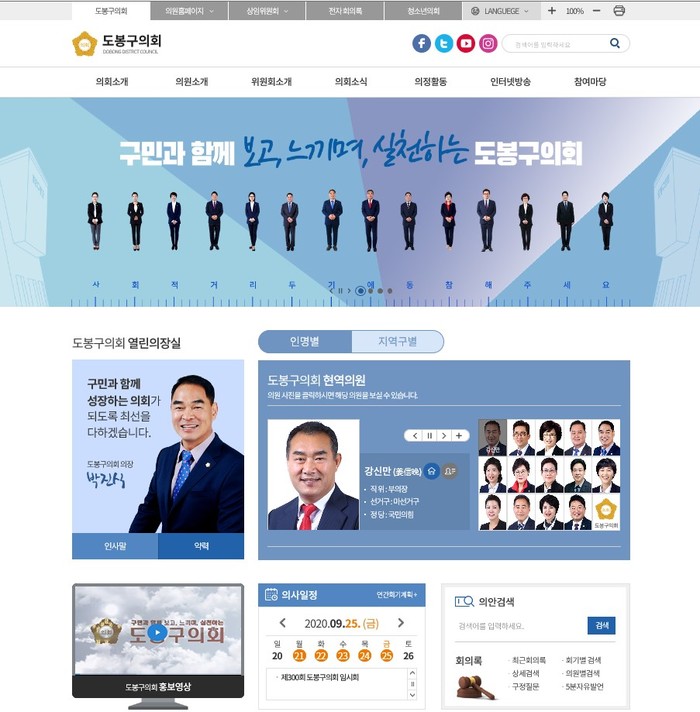 특히, 개편된 홈페이지를 통해 이달 초 오픈한 구의회 유튜브 ‘도봉굿티비’와 페이스북 등 4개의 의회 공식 SNS와 의원별 SNS로 편리하게 이동할 수 있도록 연동해 보다 다양한 채널로 의정활동을 공유하고 홍보할 수 있도록 개선했다.