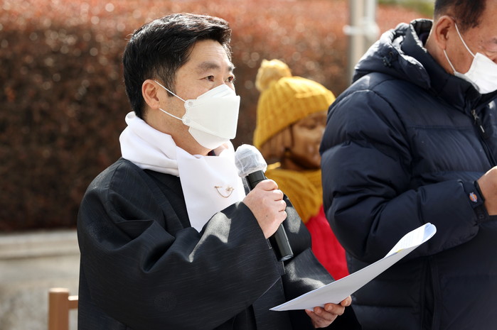 [수원=채종수 기자] 경기도의회 정대운 의원(더불어민주당, 광명2)은 2일 오전 도의회 소녀상 앞에서 일본군 '성노예' 피해자를 매춘부로 규정한 존 마크 램지어(John Mark Ramseyer) 교수를 규탄하면서, 가해자가 만든 일본군 '위안부'라는 용어를 피해자 중심의 일본군 '성노예'로 변경해야 한다는 내용의 성명서를 발표했다.