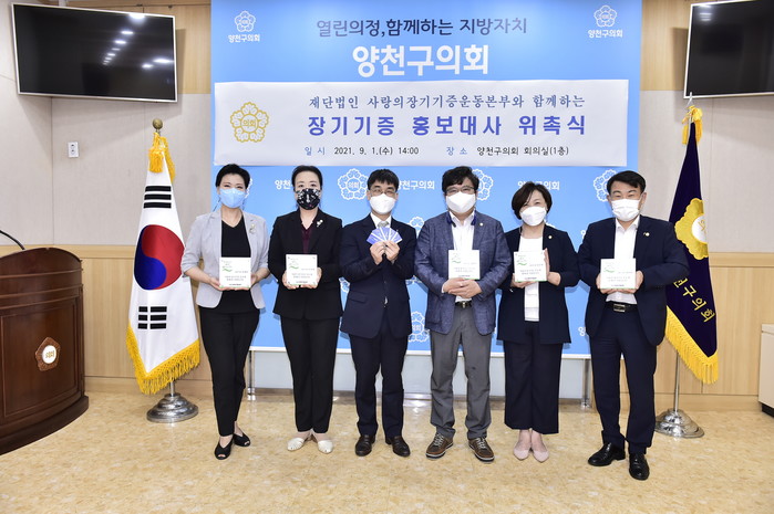 이날 사랑의 (재)장기기증운동본부는 양천구의회를 찾아 코로나19 장기화로 장기기증 희망등록자가 급감한 가운데 장기기증에 대한 인식제고와 활성화를 위해 나상희·이인락·정택진·최재란·임준희 의원을 홍보대사로 위촉했다.