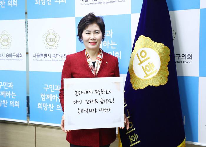 [시민일보 = 이대우 기자] 이성자 서울 송파구의장이 최근 송파구의회 3층 의장실에서 ‘금강산 관광 재개 100만 온라인 서명’ 캠페인에 동참해 평화에 대한 염원을 밝혔다.