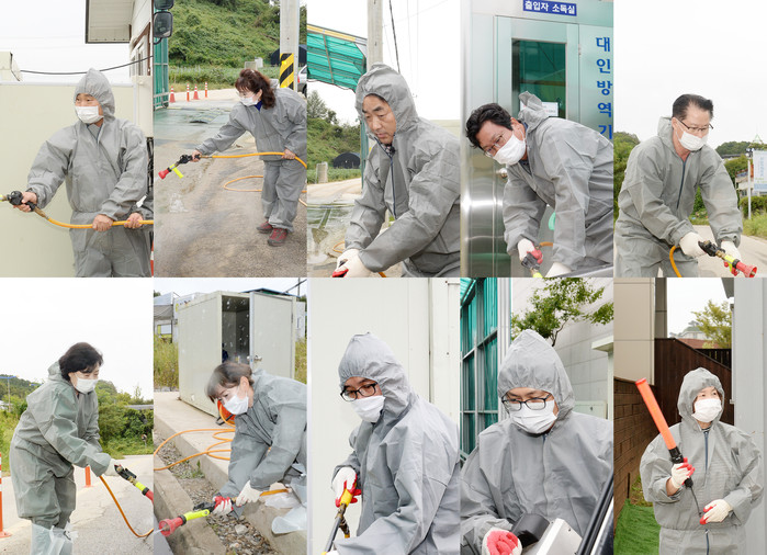 이후 의원 전원은 방역복을 갖춰 입은 후 쉴 새 없이 드나드는 차량에 소독을 실시하는 등 두 시간에 걸쳐 직접 방역 활동을 했다.