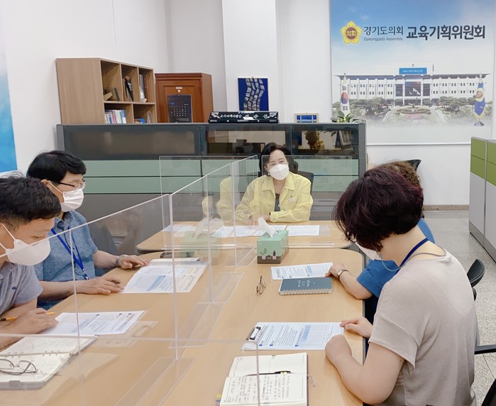 | ▲ 정윤경 교육기획 위원장이 군포의왕교육지원청 관계자들과 고3 학생 밎 교직원 코로나19 백신 접종 현황과 관련해 이야기를 나누는 모습. (사진제공=경기도의회) |