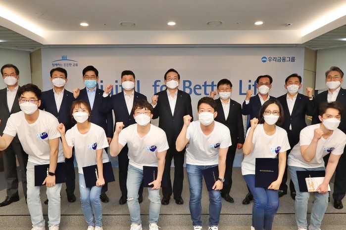 디지털 혁신에 승부수를 띄운 우리금융그룹은 『디지털혁신위원회』를 즉각 출범시켜 손태승 회장이 위원장을 맡고, 산하에 권광석 우리은행장을 총괄장으로 하는 『디지털혁신총괄』 조직을 구성해 탑다운(Top-Down)식 리더십을 확보하는 동시에, 그룹사의 젊고 혁신적인 직원들로 구성된‘블루팀(BLUE Team)’을 참여시켜 급변하는 디지털 트렌드에 대응하는 현장주도(Bottom-up) 혁신체계도 구축하겠다는 계획이다.