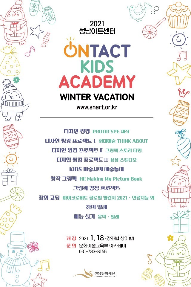 성남아트센터 아카데미는 지난해 코로나19 장기화로 정기강좌가 휴강된 가운데, 어린이 창의융합예술교육과 성인대상 강좌를 비대면으로 시범 운영했다. 이를 바탕으로 그동안 학기제로 운영해 온 아카데미를 올 상반기에는 단기 비대면 강좌를 진행한다.