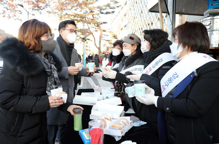 서울 강동구 여성단체협의회가 20일 코로나19와 한파·폭설로 업무에 여념이 없는 구 공무원을 위해 응원의 자리를 마련했다. 협의회는 출근시간 구청 앞마당에서 공무원들에게 따뜻한 커피와 빵을 전달했다. 사진은 이정훈 구청장(가운데)이 협의회 회원들에게 감사의 마음을 전하는 모습. (사진제공=강동구청)