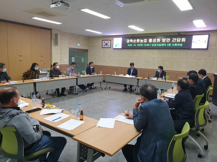경남 거창군은 지난 29일 농업기술센터 내 회의실에서 경축순환농업 활성화 방안을 모색하고자 농업기술센터 소장 주재로 북부농협(조합장 이진욱), ㈜자연순환환경기술(대표 전성준) 등 관련 업체 4명, 축산관련단체장 5명, 경종농가 3명, 담당 공무원 등 17명이 참석해 간담회를 가졌다.