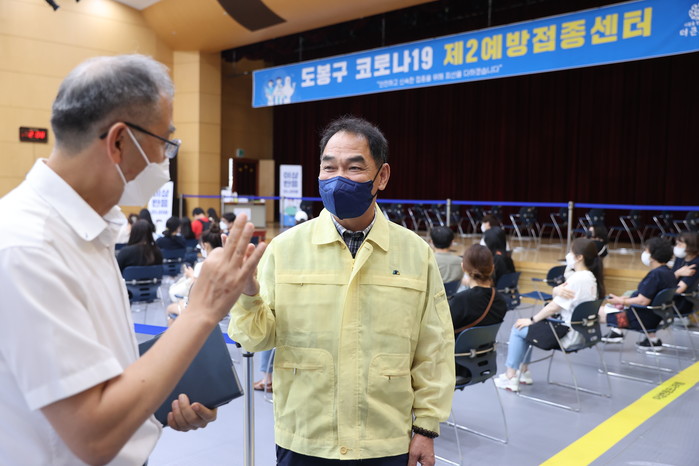 | ▲ 제2예방접종센터를 방문한 박진식 의장(오른쪽)이 관계자와 이야기를 나누고 있다. (사진제공=도봉구의회) |