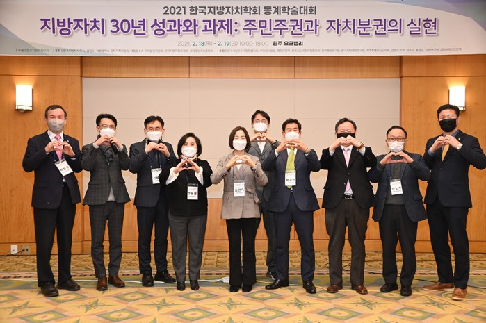 | ▲ 김안숙 의장(왼쪽 다섯 번째)이 ‘2021 한국지방자치학회 동계학술대회’ 참석자들과 기념촬영을 하고 있다. (사진제공=서초구의회) |