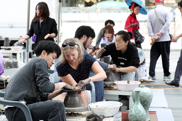 25일 서울 청계광장에서‘2019 올해의 관광도시’전남 강진군이 10월의 강진축제를 홍보 하기 위해 마련한 쇼 케이스 행사장에서 청자 물레성형 체험에 참가한 외국인이 강진군 도예가의 지도에 따라 점토 성형 체험을 하고 있다. =강진군 제공 |