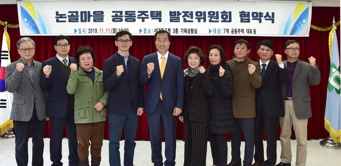 11일 서울 서대문구청 기획상황실에서 홍은2동 '논골마을'에 위치한 7개 공동주택 단지의 협력과 화합을 위한 '논골마을 공동주택 발전위원회' 협약식이 열렸다. 사진은 협약 후 단지 관계자들과 문석진 구청장(왼쪽에서 다섯 번째)의 기념촬영 모습. (사진제공=서대문구청)