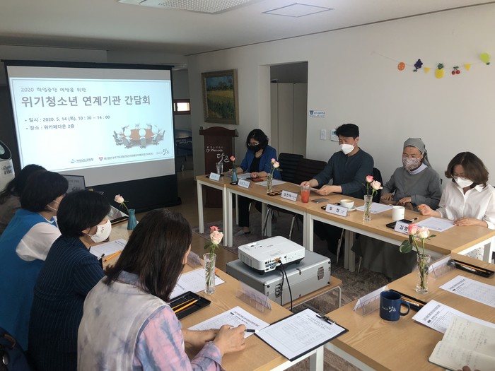 지난 5월 14일 2020. 학업중단 예방을 위한 위기청소년 연계기관 간담회가 Weecafe 다온에서 개최되었다. 청소년쉼터 5개기관, 로뎀의 집, 범숙의 집 관장 및 센터장이 참석하여 기관별 위기학생 지원 방법을 공유하고 위기청소년의 학업중단 예방 방안에 대한 의견을 나누었다.