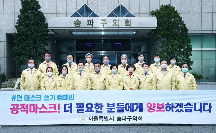 [시민일보 = 이대우 기자] 코로나19의 전국적 확산으로 인해 마스크 품귀현상이 빚어지는 가운데 서울 송파구의회(의장 이성자) 전의원들이 보건용 마스크 대신 면 마스크를 착용하고 제274회 임시회에 참석하는 등, 나보다 더 필요한 사람들에게 마스크를 양보하자는 의미를 담아 ‘면 마스크 쓰기 캠페인’을 펼쳤다.