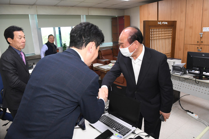 | ▲ 윤준용 의장(오른쪽)이 결산검사장에 방문해 결산검사 위원들과 인사를 나누고 있다. (사진제공=영등포구청) |