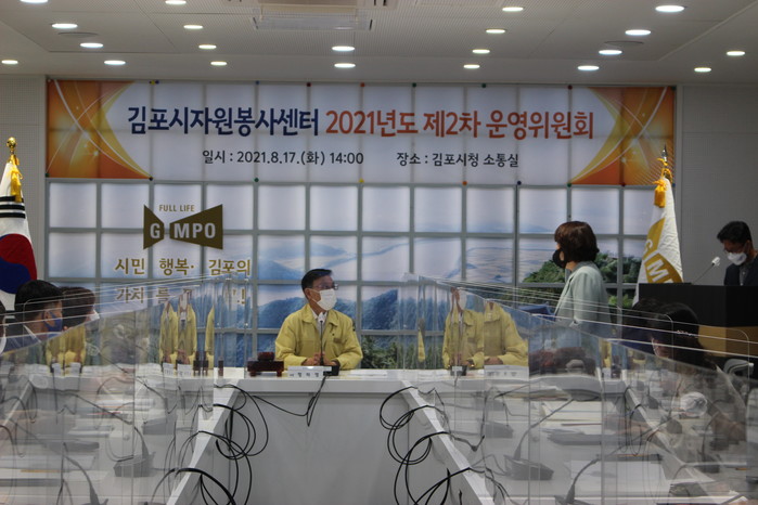 경기 김포시자원봉사센터는 지난 17일 시청 소통실에서 제2차 운영위원회를 개최했다. 운영위원회는 15명으로 구성돼 있으며, 2022년 예산안과 단위사업계획안에 대해 심의했다. 사진은 정하영 시장(가운데)이 참여자와 의견을 나누고 있는 모습. (사진제공=김포시청)