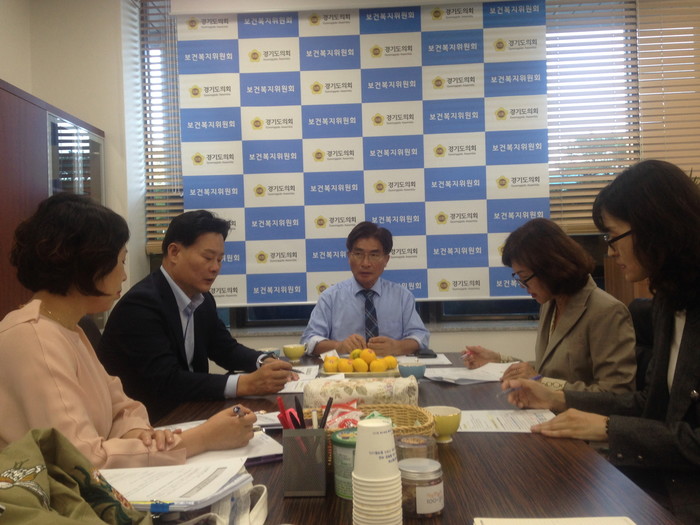 [수원=채종수 기자] 경기도의회 정희시 보건복지위원장(더불어민주당·군포2)은 최근 보건복지위원회 회의실에서 최종현 부위원장(더민주·비례), 김원녀 경기도장애인복지시설협회장 등 관계자들과 ‘경기도장애인복지시설 직원 역량강화교육사업’ 등의 현안을 논의했다.